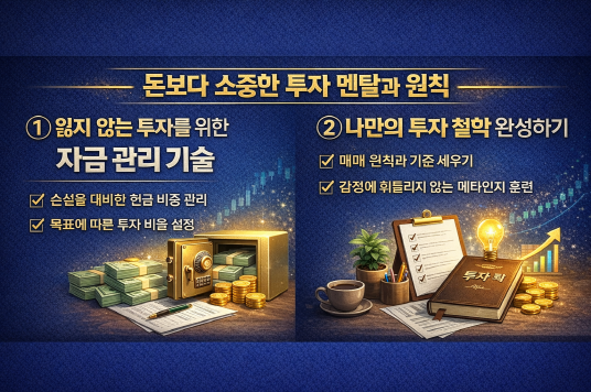 마지막 10편에서는 그동안 배운 지식들을 하나로 엮어 나만의 투자 스타일을 정립합니다. 저평가된 우량주를 사서 기다리는 '가치 투자'가 맞는지, 아니면 강한 수급을 따라가는 '모멘텀 투자'가 맞는지 본인의 성향을 파악해 봅니다. 투자 일기를 쓰는 법과 정보를 필터링하는 자신만의 루틴을 만드는 과정을 통해, 시리즈가 끝난 후에도 스스로 성장하는 '자립형 투자자'로 거듭날 수 있는 마지막 퍼즐 조각을 맞춰 드립니다.