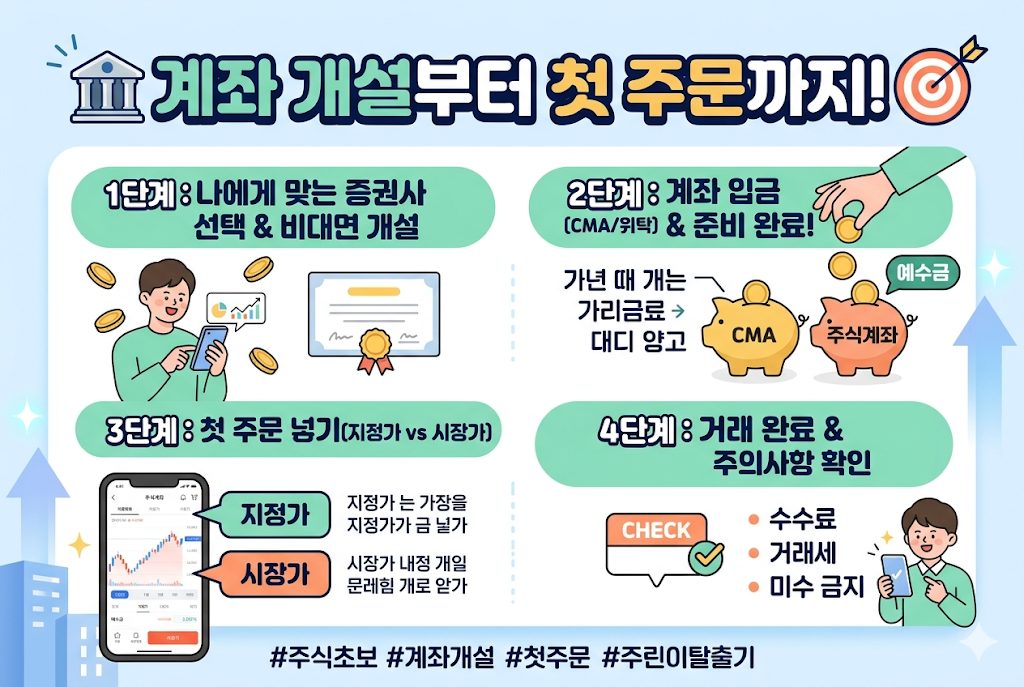 주식 투자의 첫걸음은 나에게 맞는 증권사 계좌를 개설하는 것입니다. 혜택이 많은 CMA와 일반 위탁계좌의 차이를 이해하고, 비대면 개설을 통해 수수료 혜택을 챙기는 것이 시작입니다. 또한, 주가에 직접 영향을 주는 시장가와 지정가 주문의 매커니즘을 파악해야 내 소중한 자산을 원하는 가격에 정확히 매수하고 매도할 수 있습니다. (약 150자)