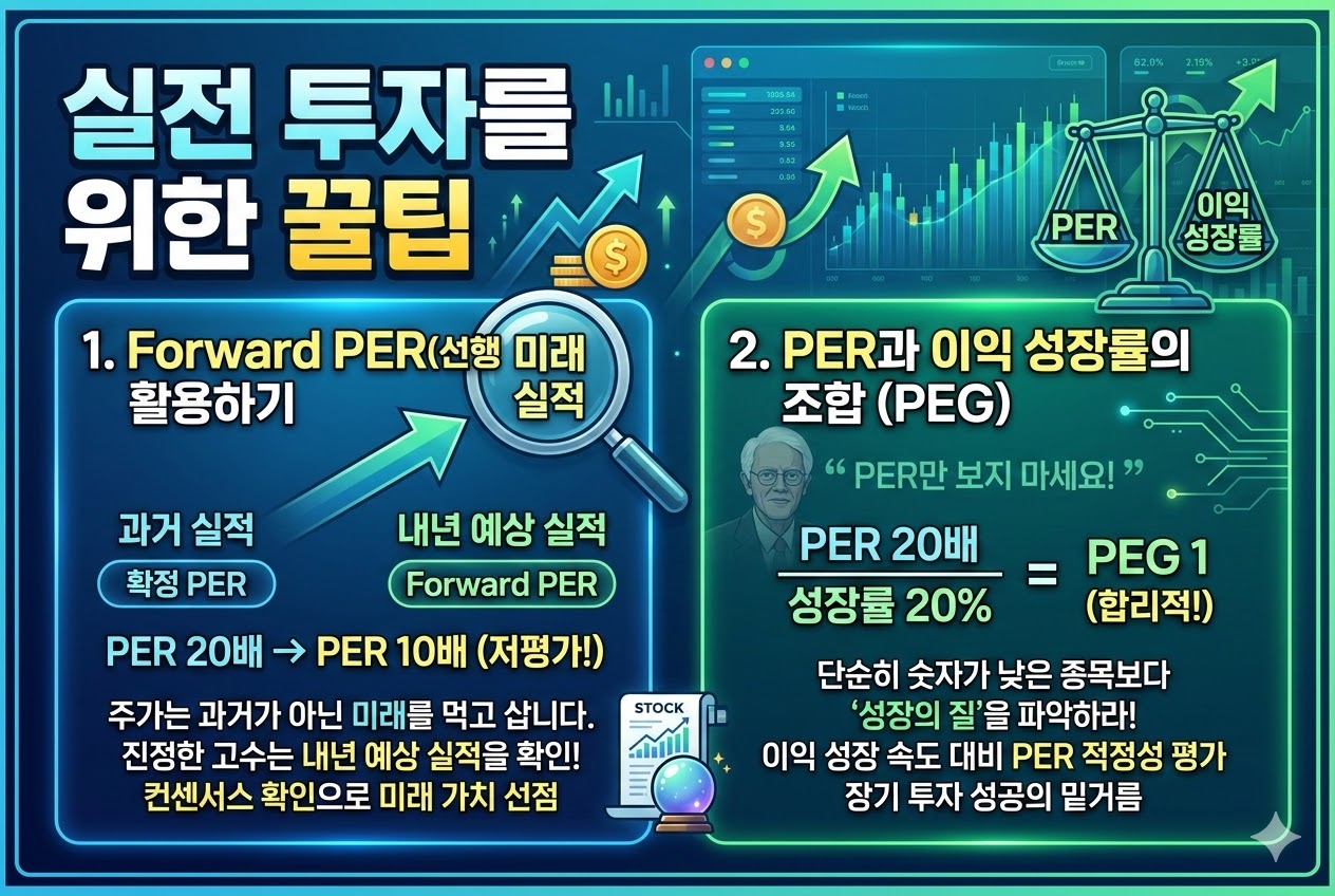 주가는 과거가 아닌 미래를 먹고 삽니다. 일반적으로 포털에서 보는 PER은 과거 실적 바탕의 '확정 PER'입니다. 하지만 진정한 고수는 내년 예상 실적을 바탕으로 계산한 'Forward PER'을 확인합니다. 과거 PER은 20배로 비싸 보였는데, 내년 이익이 2배로 늘어날 예정이라 Forward PER이 10배로 떨어진다면, 그 주식은 지금 당장 사야 할 저평가 종목이 되는 셈입니다. 증권사 리포트의 컨센서스를 확인하여 미래 가치를 선점하는 것이 수익률 극대화의 핵심 비결이라 할 수 있습니다.